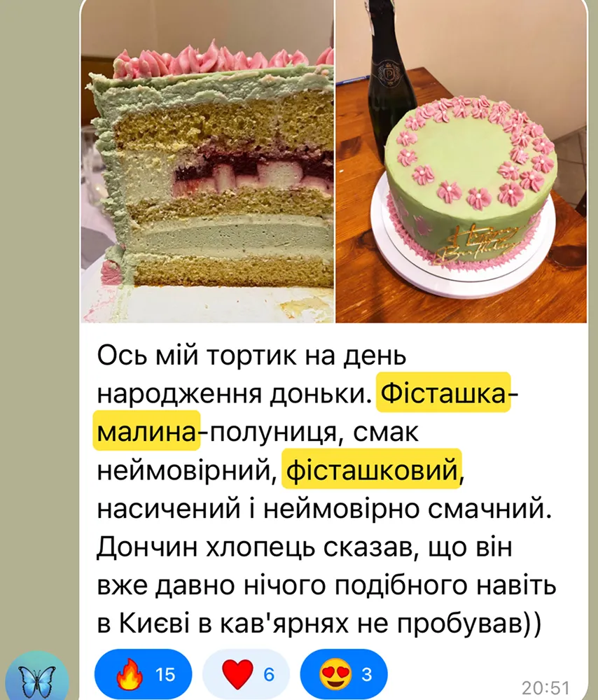 Романтичний. Свіжий. Горіхово-ягідний.Цей торт — гармонійна історія про ніжність: поєднання благородної фісташки та соковитих ягід створює витончений, легкий і водночас яскравий десерт. Ідеально підходить для весняно-літніх замовлень, свят, романтичних подарунків і тих моментів, коли хочеться щось “фісташково-ягідне” і дуже смачне.