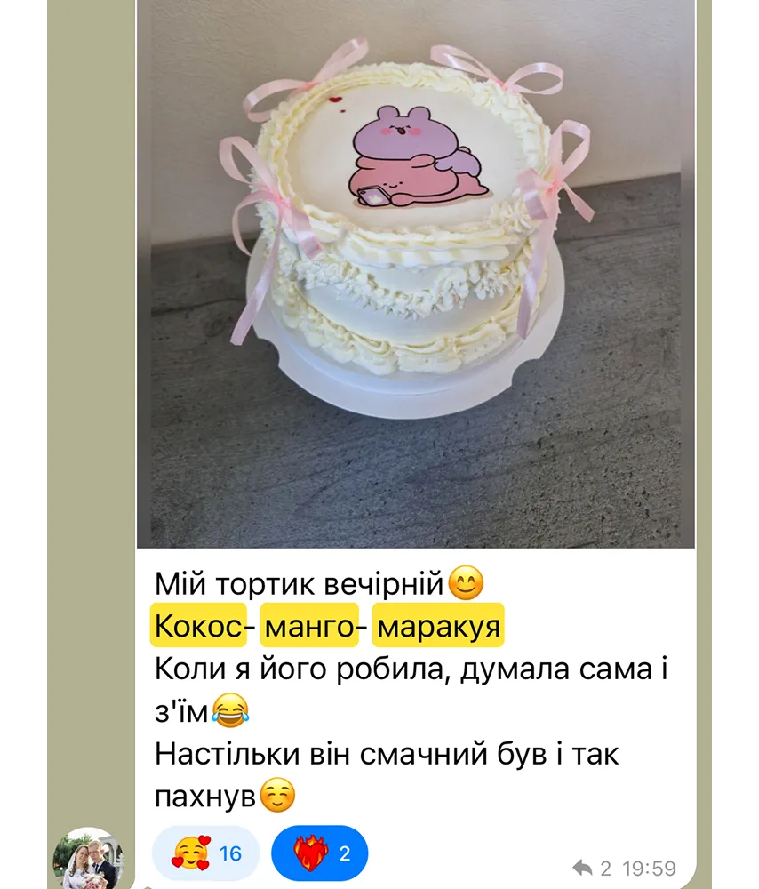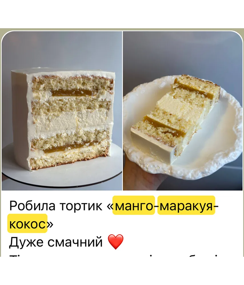 Екзотичний, освіжаючий, яскравий.Цей торт — справжній шматочок літа з тропічним характером: ніжний кокосовий бісквіт, кисло-солодке конфі та легкий мус. Ідеально підходить для спекотного сезону, замовлень типу “хочу щось свіже” та десертного WOW-ефекту.