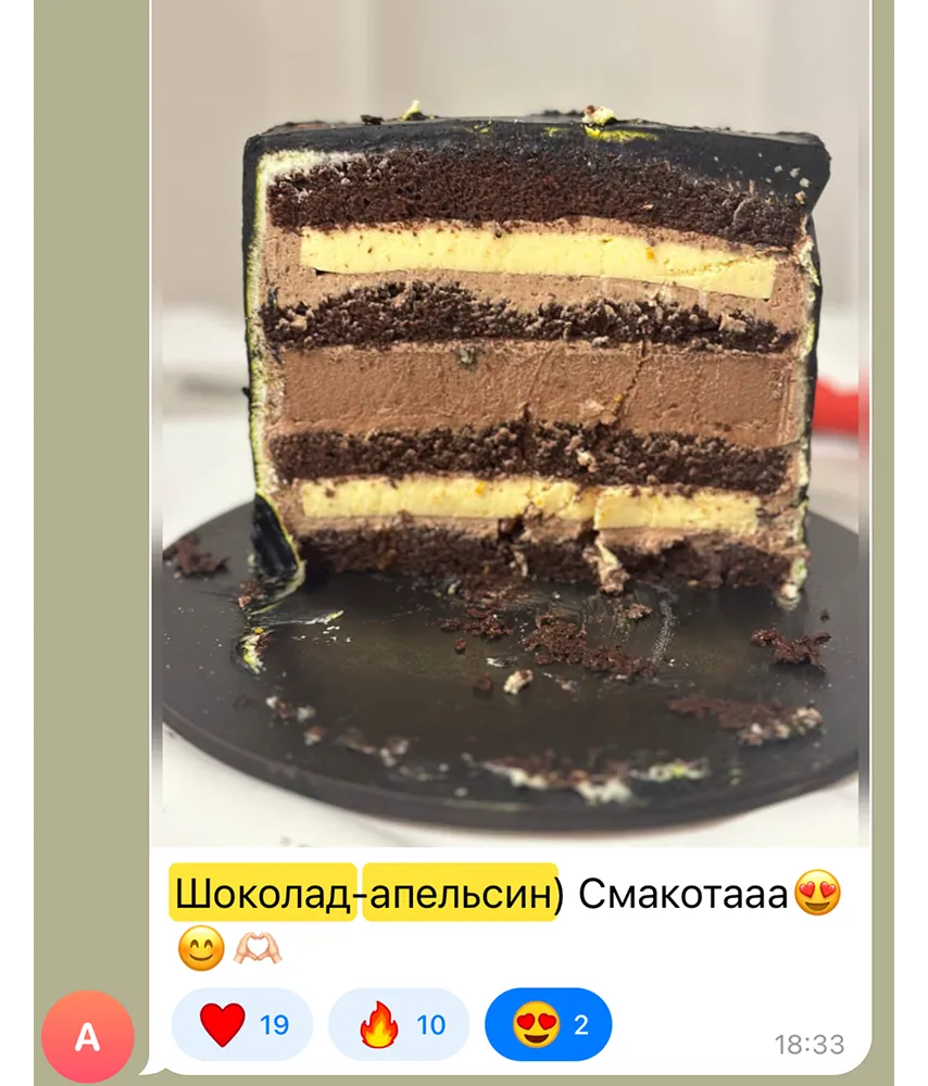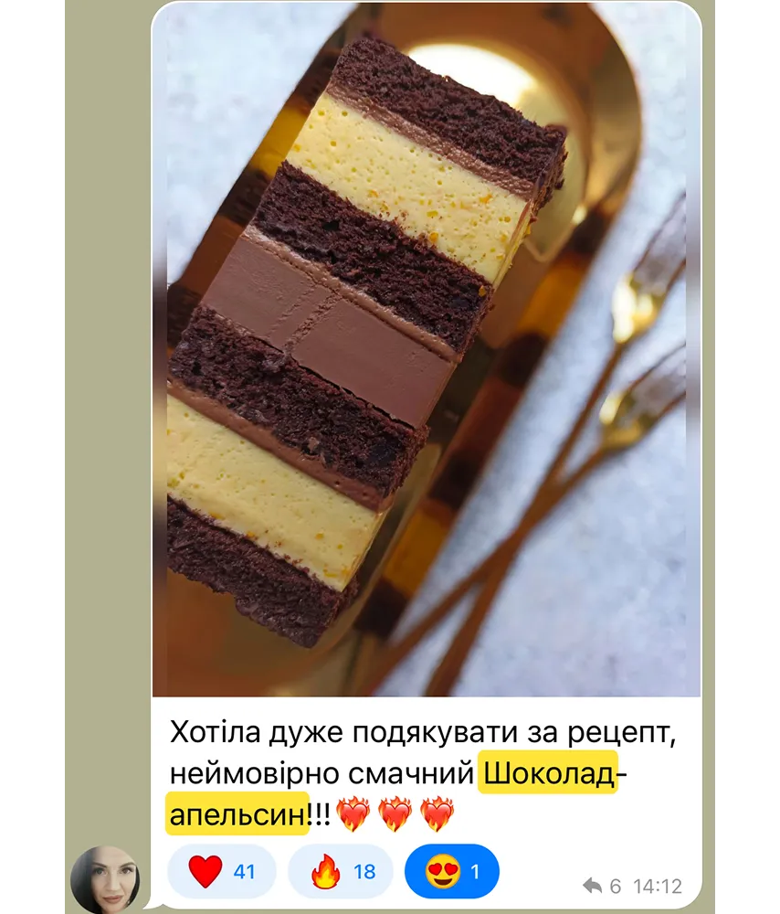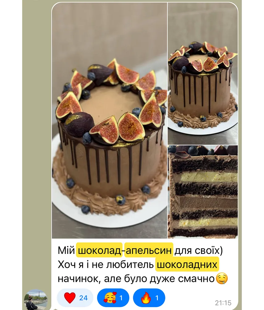 Насичений. Цитрусовий. Гармонійний.Цей торт — поєднання глибокого шоколадного смаку та свіжої апельсинової ноти. Ідеально підходить для тих, хто любить баланс між солодким і яскраво-фруктовим, а також хоче ефектний і впізнаваний смак у кожному шматочку.
