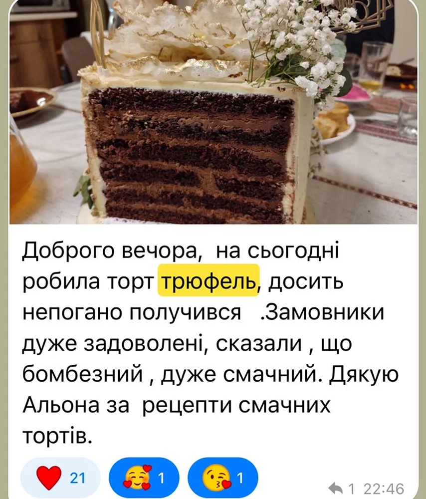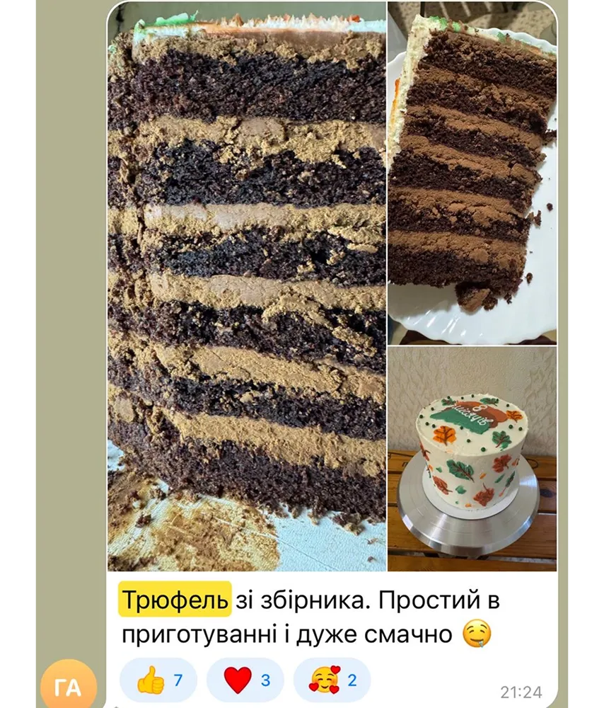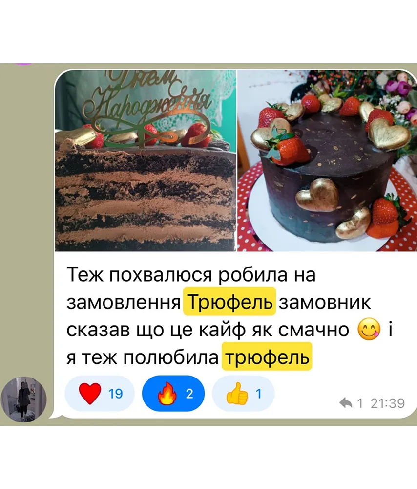 Максимум шоколаду. Мінімум зайвого. Чиста насолода в кожному шматочку.«Трюфель» — це ідеальний торт для поціновувачів глибокого, вишуканого смаку. Ніжний бісквіт і насичений крем створюють дует, у якому немає нічого зайвого — лише концентрований шоколадний кайф.