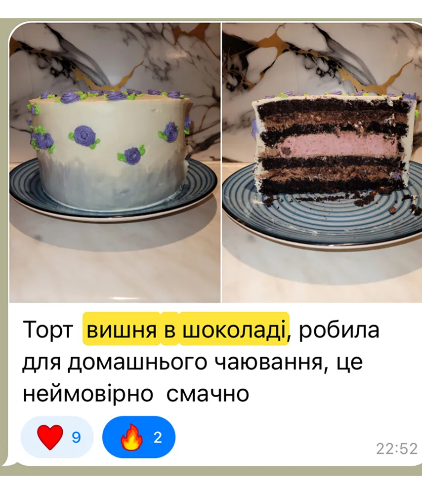 Класичне, безпрограшне поєднання — глибокий шоколад і соковита вишня.Цей торт — насичений, ароматний і водночас збалансований. Ідеально підходить для свят, вечірніх десертів та клієнтів, які “люблять щось ніжне, але з характером”.